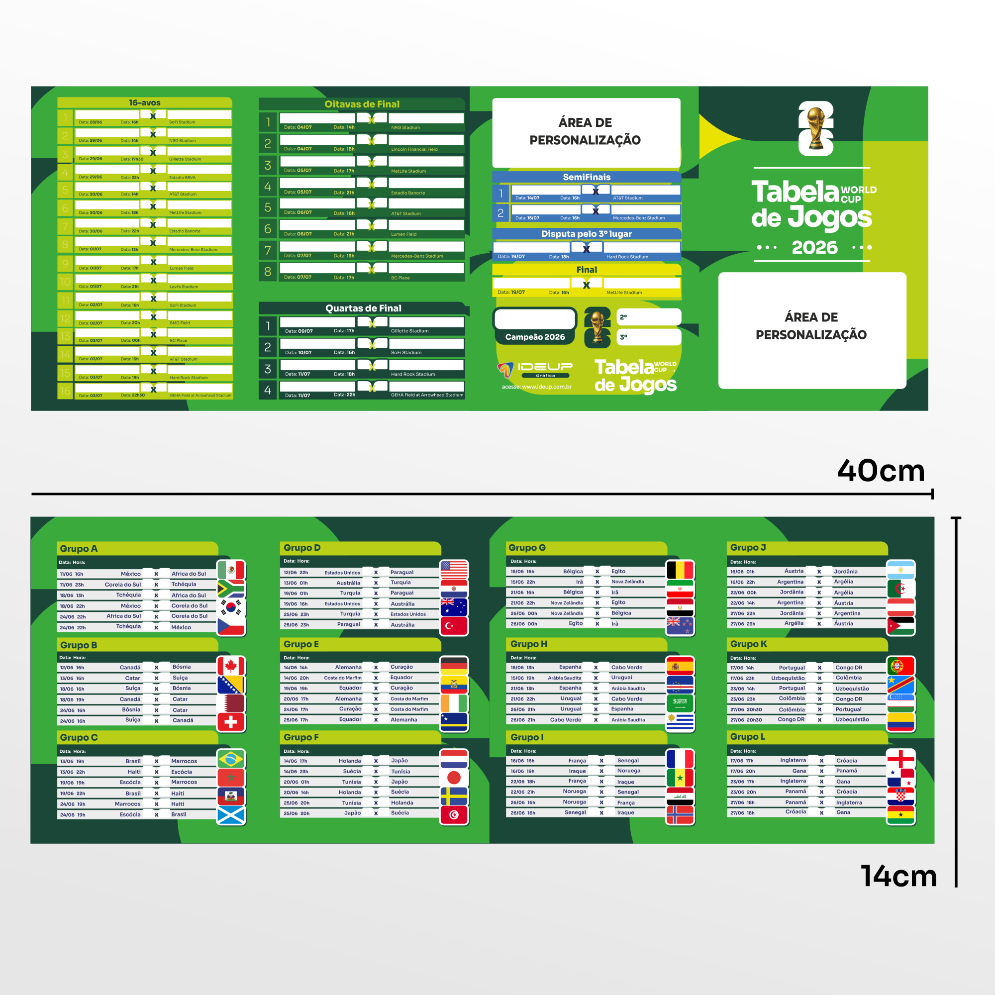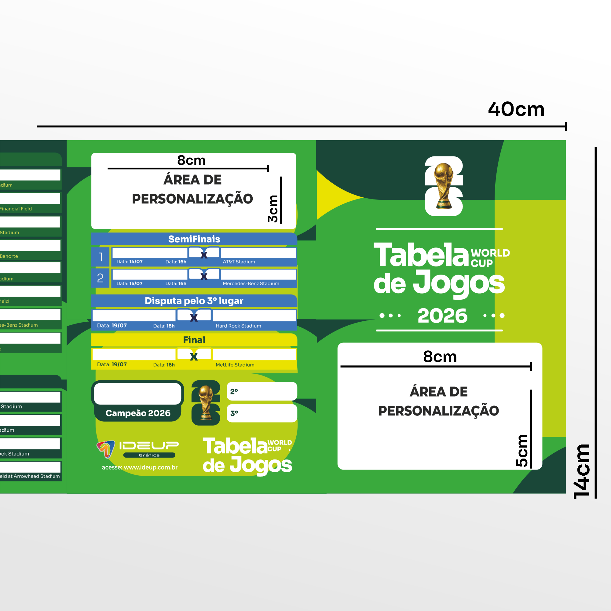 Produzida pela Gráfica IDEUP, essa tabela é ideal para empresas que desejam aproveitar o clima da Copa do Mundo para divulgar sua marca de forma criativa e eficiente.