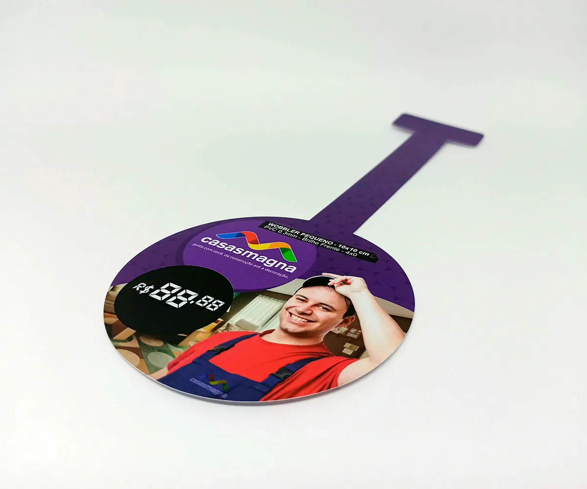 Descrição Wobbler Pequeno PVC 0,3mm – Brilho Frente